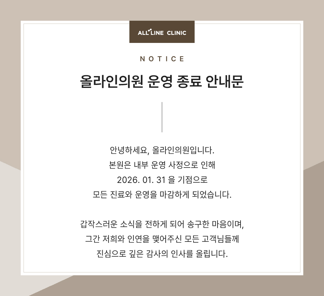 ![]() 안녕하세요, 올라인의원입니다. 본원은 내부 운영 사정으로 인해 1/31(토)를 기점으로 모든 진료와 운영을 마감하게 되었습니다. 갑작스러운 소식을 전해드리게 되어 송구한 마음이며, 그간 저희와 인연을 맺어주신 모든 고객님들께 진심으로 깊은 감사의 인사를 올립니다. 1. 미사용 티켓 및 잔여 선결제 환불 안내 ■접수 기간: 2026년 1월 31일(토)까지 ■ 접수 방법: 구글폼 접수 https://forms.gle/vMnAbah51DAFkvqT6 ■ 필요 증빙: 본인 확인 자료(신분증 등) *대리 신청 시 위임장 등 추가 서류가 필요할 수 있습니다 (카카오채널 문의 시 안내) ■ 환불 처리 일정: 2월 초부터 접수 순서대로 순차 처리/입금 예정 2. 진료기록부 보관 및 사본 발급 안내 ■ 병원 발급 기간: 운영 종료 후에도 2026년 2월 13일(금)까지 본원에서 직접 사본 발급이 가능합니다. ■ 구비 서류: - 본인 신청: 신분증 (상황에 따라 추가 서류 요청 가능) - 이후 보관 및 발급: 2월 13일 이후에는 의료법에 따라 진료 기록이 전자기록의 형태로 보존됩니다. - 폐업 후 발급 방법: 관할 보건소를 통해 본인 확인 절차를 거쳐 기록을 발급받으실 수 있습니다. 본 발급 시 본인 확인을 위한 신분증이 필요하며, 대리 신청 시 위임장 등 추가 서류가 필요할 수 있습니다. 3. 관련 문의 ■ 카카오톡 채널 [올라인의원] 문의량이 많아 전화 연결이 어려울 수 있으니, 카카오톡으로 메시지를 남겨주시면 순차적으로 답변 드리겠습니다. 마지막까지 불편함 없으시도록 최선을 다하겠습니다. 감사합니다. |